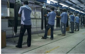 用這種新技術研發出的投加工藝分為干法和濕法兩種:濕法工藝是將臭氧溶解在水中形成臭氧溶液,然后用噴霧器將溶液噴在牛仔服需要脫色的部位。干法工藝需先用水潤濕要加工的面料,利用不同的酸堿度pH值來控制脫色率,再把臭氧直接噴在脫色部位使其脫色。這種工藝效率高,時間短,可滿足不同脫色圖案的加工需要,成品手感柔軟舒適。