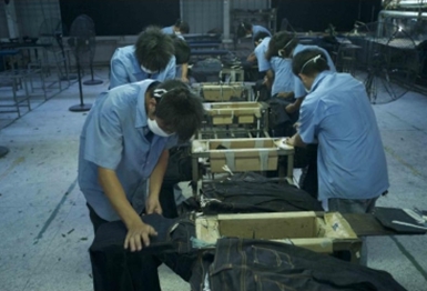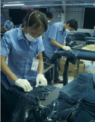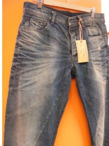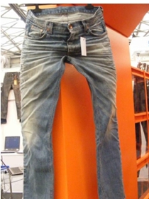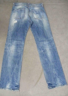 a) 在洗水前,通過使用砂輪滾動摩擦而使布面染料褪色,手擦的地方通常是脾位和臀位,人為的機械褪色,讓牛褲在洗水后顯得自然地懷舊和泛白