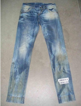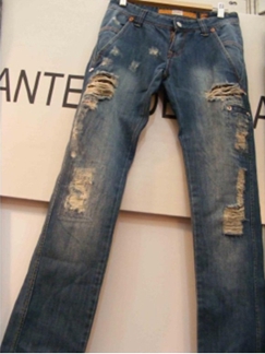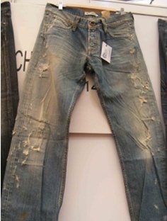 將衣物在洗水前,人為地將褲腳,褲頭等一些特定部位用銳器刮爛,從而制成洗后的破爛懷舊效果