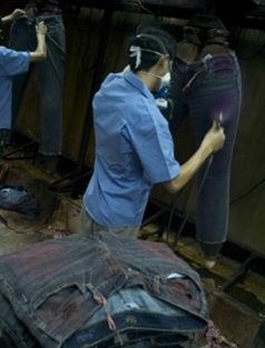噴一些氧化劑,一般是高錳酸鉀溶液,讓衣物局部褪色,從而讓牛褲顯得自然地懷舊和泛白